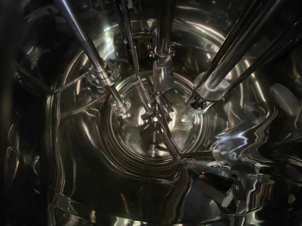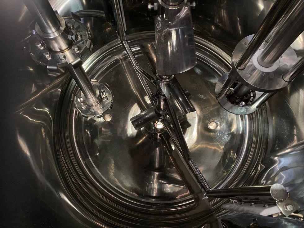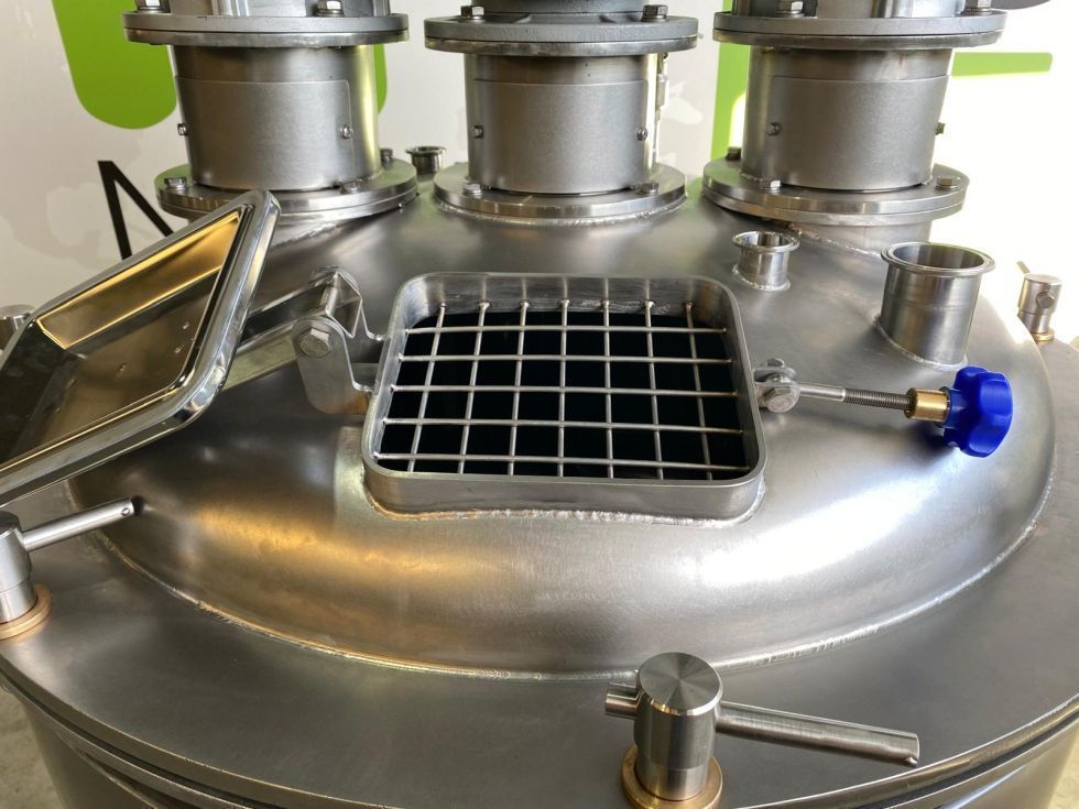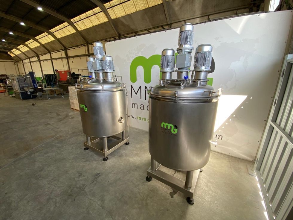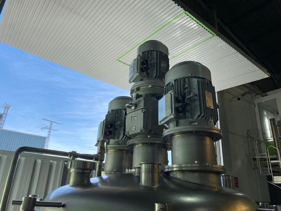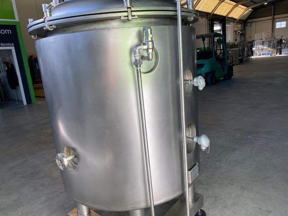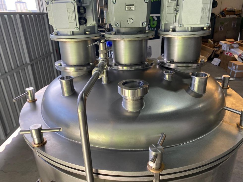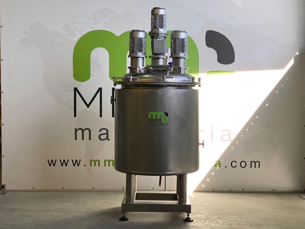 | Detalles | Depósito cilíndrico vertical en acero inoxidable sanitario. Incorpora tres tipos de agitación: agitación de triple hélice con rascador, tipo doble Cowles, y emulsionador. Fabricado en acero AISI 316/316L para partes en contacto con el producto. Recomendado para salmueras, productos ácidos o farmacéuticos, con diseño orientado a higienizabilidad: soldaduras pulidas, radios sanitarios, drenabilidad completa. El equipo consta de un circuito CIP con unas bolas de limpieza sanitaria con cabezal rotativo para realizar ciclos de limpieza automáticos. El equipo consta de doble camisa y calorifugado exterior de protección para alta temperatura. Soportado sobre una bandada de tubo con bases regulables para nivelación del equipo. El reactor de 600 litros de capacidad nominal está formado por fondo tipo Klopper de 1000 mm de diámetro, virola de 1000 mm de altura y cerrado en su parte superior por otro fondo Klopper con boca de hombre para aditivar, mirilla y diferentes picajes para posicionar las bolas de limpieza y entradas de producto. En el centro de la tapa se dispone de tres linternas que soportan los motores de accionamiento del mecanismo mezclador/agitador. El sistema de agitación consta de un eje vertical acoplado al motorreductor de accionamiento sobre el que se montan dos elementos, un agitador de palas y un conjunto rascador; otro sistema de agitación tipo Cowles a doble altura conectado directamente a un motor cuya función es la de provocar un gran esfuerzo cortante al producto a gran velocidad, y un tercer motor conectado a un eje acompañado de un sistema para emulsionar la mezcla de forma eficiente. Este reactor está recubierto por una segunda camisa de similares características y con una separación de 40 mm, espacio que tiene la propiedad de calentar el producto y mantenerlo a la temperatura adecuada de proceso de agitación. El conjunto descrito se soporta mediante tres patas de tubo redondo mm dispuestas a 120 º soldadas a la base del depósito. Características Capacidad: 600 litros Altura motor central: 750mm Altura motores laterales: 550mm Largo boca hombre superior: 240mm Ancho boca hombre superior: 200mm Altura patas: 560mm Altura doble fondo: 1.000mm Altura virola: 1.100mm Altura Klopper superior: 200mm Altura total: 2.700mm Diámetro virola: 1.060mm Diámetro total: 1.100mm Diámetro boca salida: 60mm