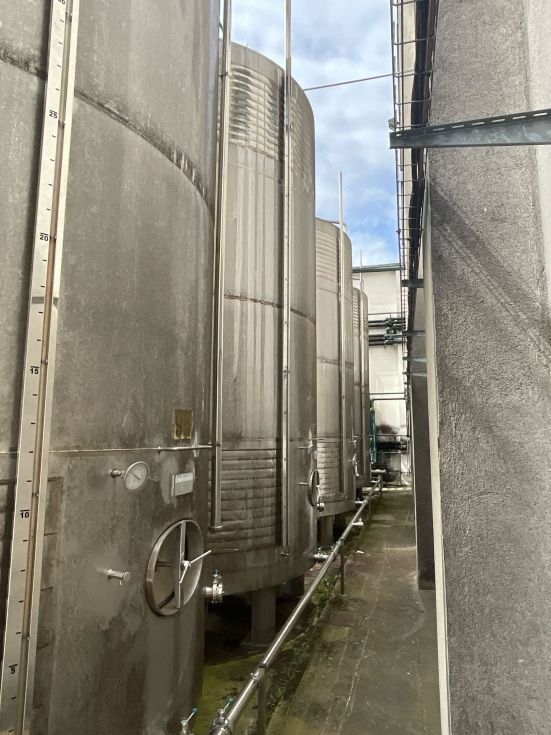 | Detalles | Dos depósitos de elaboración de 60.000 litros en inoxidable con camisa de frío arriba y abajo del cuerpo. Fondo plano inclinado. Boca de hombre en la parte inferior del cuerpo. Control de nivel visual exterior. Montados sobre patas. 3550mm de diámetro x 6000mm de alto. En perfecto estado. |