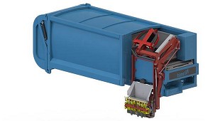 fácilmente con una tolva que funciona también como placa eyectora. Al no ser necesario volcar la carrocería, es una opción estable, compacta y de fácil limpieza. (Contenedores para recogida selectiva)