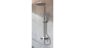 flexo extensible inoxidable, una barra deslizante con diferentes alturas, un rociador superior anti cal y un grifo monomando. La medida del cabezal es de 20 cm, la del el mango