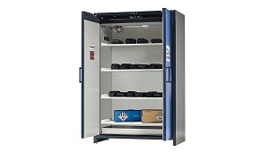 lacada). Para recoger posibles derrames de baterías que entren en combustión. Puertas con cerradura de cilindro (función de cierre) e indicación de estado de cierre (rojo/verde). Control electrónico con contacto