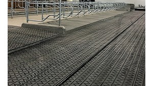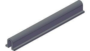 estabulado con 150 mm de ancho y 1.200 mm de largo. Tiene un espesor de 20 mm y 150 mm de altura con 13 kg de peso. (Alfombras y suelos para ganado vacuno)