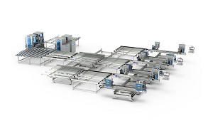 CNC de cuatro cabezales. - La información de identificación del perfil se transfiere automáticamente desde las soldadoras 4 cabezales. - Las estaciones de transferencia móviles transportan de forma automática los bastidores, desde