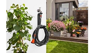 terrazas o porches. El nuevo soporte permite transportar fácilmente la manguera textil Liano por el jardín y luego guardarla de forma más cómoda. El soporte Liano TapFix es rápido y fácil