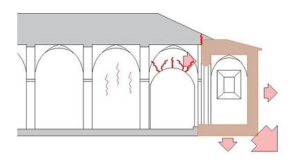 capillas laterales con el techo más bajo recorren el espacio sin interrumpir la visión longitudinal, también en este paramento la solución estructural parece no llegar al suelo. La sofisticada solución