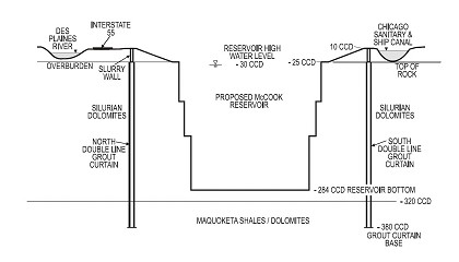 dolomita Silúrica, requiere medidas avanzadas de inyección para garantizar su eficacia y sostenibilidad. Perfil general del proyectado embalse de McCook. Fuente: proyecto original: State-of-art grouting for a groundwater