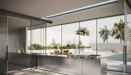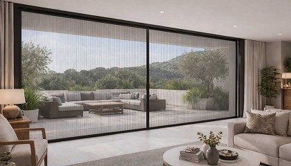 porches y grandes cerramientos acristalados. El sistema plisado ofrece una apertura lateral suave y controlada, con una presencia visual ligera que no interfiere en el diseño arquitectónico. La sección de perfil
