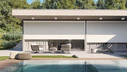 Quadro, con caja biselada a 45°. Screen Round, de diseño curvo. Screen Zip combina tejido técnico con sistema de guiado zip. Cada variante puede configurarse con tejidos translúcidos u opacos