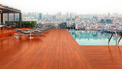 tarimas de exterior, al combinar ventajas de las tarimas de madera tropical con ninguno de sus inconvenientes. La tarima de la imagen es de Dasso, distribuida por Distiplas Floors / Maia