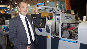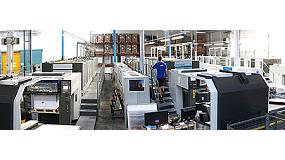 Indigo 30000, con unidad de imprimación integrada capaz de imprimir en cuatricromía cartones de hasta 450 g/m 2 . La barnizadora en línea Harris & Bruno ExcelCoat ZR30 aporta eficiencia en la fase