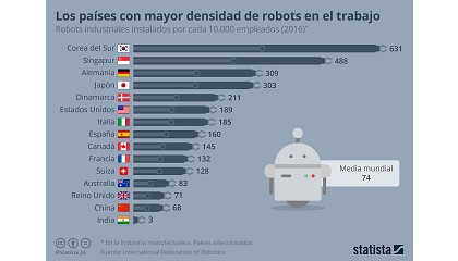 Statista, mientras que la media de robots por cada 10.000 empleados en la industria manufacturera mundial era de 74 en 2016, en España esta alcanzaba los 160 (un 54% mayor