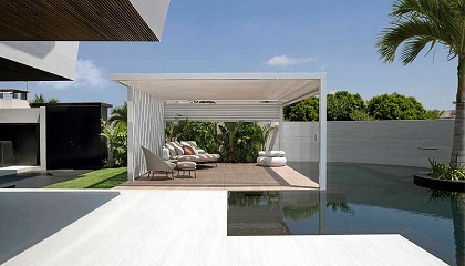 barandillas, con una entrada y escalera que siguen este planteamiento ‘horizontal’ que avanza hasta llegar a los dormitorios. La fachada utiliza porcelánico de efecto travertino, transmitiendo luminosidad y textura pétreos