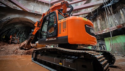 total (cabina en posición baja): 3.080 mm Altura total (barandilla): 3.390 mm Ancho total (transporte): 2.990 mm Radio de giro trasero: 1.680 mm Ancho de zapata de oruga: 600 mm