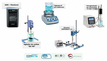calefactor, etc.); agitadores de varillas, diseñados para trabajo en continuo, hasta 40 litros y 1MM mPascal, con múltiples accesorios; diversas versiones de agitadores rotativos y basculantes para diferentes continentes y con diferentes