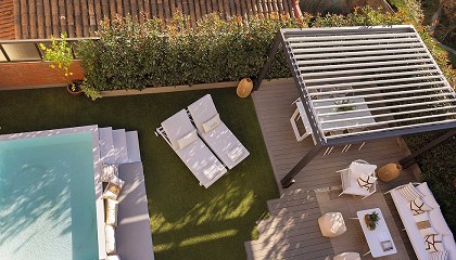 césped artificial Lynxturf, de Jardí Pond, adecuado para pisar con los pies descalzos. La piscina, diseñada a medida en blanco, se ha ubicado estratégicamente en la zona de la izquierda