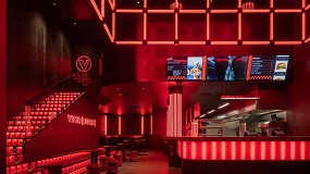 escalera con peldaños retro iluminados en rojo, un detalle que remite al universo del clubbing y refuerza la identidad única de Vicio. Desde sus originales espacios corporativos, pasando por la sofisticación