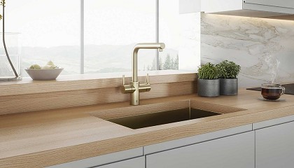 grifo de agua caliente 3N1 en forma de J con acabado en Rose Gold. Grifo 3N1 en forma de L con acabado en Gold Satinado. El nuevo grifo de agua