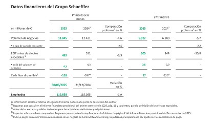 informe financiero provisional para los seis primeros meses de 2025. El volumen de negocios del Grupo Schaeffler de los seis primeros meses del año ha ascendido a 11.845 millones de euros
