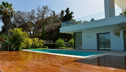 corredera elevable de apertura monocarril, bicarril, tricarril y galandage, incluye rodamientos con rotura de puente térmico y sistema de cierres multipunto. Villa de Marbella que cuenta con el sistema S88RP.