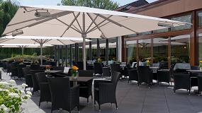 parasoles con lamas fijas y sistema de rotación oculto. El nuevo concepto de estructura está disponible en formatos de 4,5 y 7 metros. Ambas ofrecen el añadido de ser compatibles