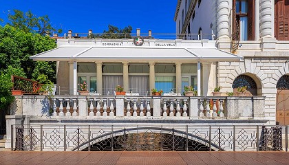pergola classic’, un sistema de toldos con carriles guía laterales y columnas adornadas. Varios módulos de toldos, con barras LED integradas, proporcionan ahora sombra a cerca de 50 asientos en una gran