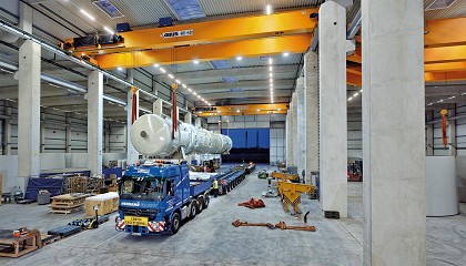 puentes grúa con capacidad de 80 toneladas. Estas grúas tienen dos polipastos individuales de 40 toneladas de capacidad cada uno. La agencia de transporte Hegmann confía en los sistemas de grúas