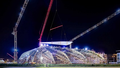 grúa pudiera extenderse hasta 117,5 m con capacidad suficiente. Luego, cada panel se bajó de manera segura para permitir una fácil alineación para una mayor seguridad. Además, se desplegaron seis grúas móviles, que varían en capacidad de 50 a 350 toneladas, para la instalación de varias estructuras en la Expo, incluidos los portales del puente