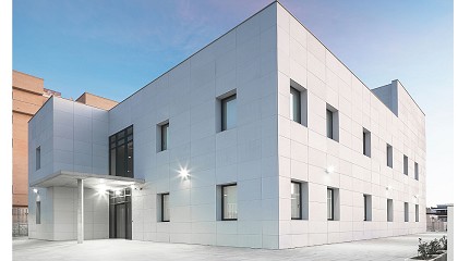 reviste en todo su perímetro con un sistema de fachada ventilada de hormigón polímero, a excepción de la fachada sur en la que se emplea un muro cortina como acceso