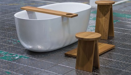 roble europeo macizo. Cuenta con taburete y banco, reposapiés, toallero y puente de bañera de roble aceitado, que pueden cumplir diversas funciones y que están adornados con accesorios de cuero