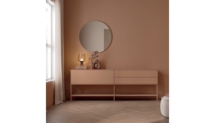 Roble Organic, Carbón, Cera, Pietra o Nut, combinaciones que aportan calidez y contraste. Algunos modelos pueden incorporar vitrinas, con cristal en acabados Flutes o Parsol Gris, que realzan el estilo