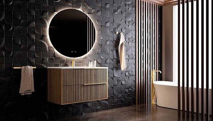 tiradores en tres acabados distintos: oro cepillado, cromo y negro mates. Mueble Reel y grifo Concept3. También ha destacado la presentación del galardonado Mumo, el nuevo mueble de baño compacto