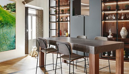 tiradores. En uno de los laterales se sitúan los muebles en columna hasta el techo que reúnen los electrodomésticos integrados, el espacio para la despensa y almacenaje. Una vitrina con paneles