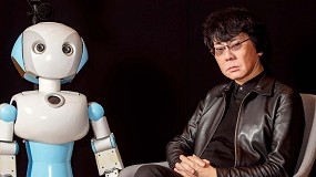Caixa. Fiel a su emblemática indumentaria negra, Hiroshi Ishiguro saluda a la audiencia que asiste a su conferencia ‘Avatares y nuestra futura sociedad’ en el Museo de la Ciencia CosmoCaixa