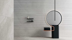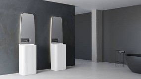 cajonera que se une al lavabo gracias a un brazo metálico que lo envuelve. Este mismo enganche da continuidad visual al espejo circular que completa la pieza, con una gama