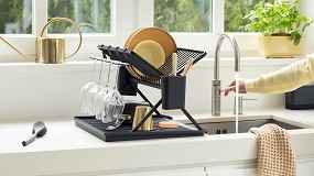 cepillo para platos. La bandeja del organizador es recogegotas y extraíble para evitar que el agua se acumule, mientras que el fondo acanalado mantiene el cepillo en posición vertical. El dispensador