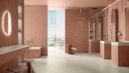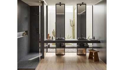 Dekton con textura efecto microcemento, hasta encimeras de resina con lavabo integrado, muebles decorativos de ratán de Vibra, iluminación ambiental y sistemas de ducha a medida. Asimismo, se incluyen griferías