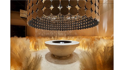 Dekton de Cosentino con agua –que, al tocarla, cambia el color de todo espacio, como si de un atardecer se tratara–, sobre la que se cierne una imponente cúpula de 450 rociadores