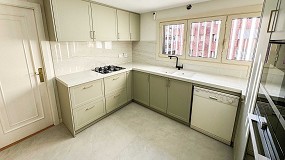 encimera con faldón, doble seno y grifería empotrada. Todas las paredes se han revestido con papel pintado, aportando coherencia estética y un alto grado de personalidad al espacio. En cuanto