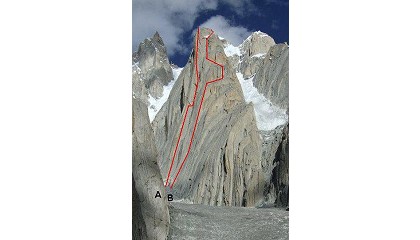 K7, en la región paquistaní de Hushe. Sigurd Felde, Ole Ivar Lied, Henki Flatlandsmo y Odd-Roar Wiik permanecieron veinte días en la pared para abrir una vía de 22 largos