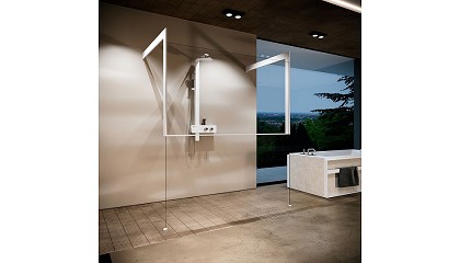 mamparas Line. Entre las novedades orientadas al diseño flexible destacó Verso, una colección modular de mobiliario para baño, y los lavabos a medida Modo Dash, realizados en Surfex, un material
