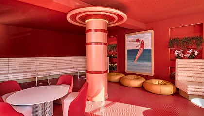 nadadoras y surfistas añaden frescura y juventud, mientras que los mosaicos de gresite y las formas curvas del mobiliario aportan movimiento y dimensión a los espacios. Sin duda alguna, la dedicación