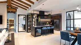 Pando, lo que asegura una cocina eficiente y libre de humo. La encimera está realizada con placas cerámicas de gran formato de la colección L Marmi de la marca Level