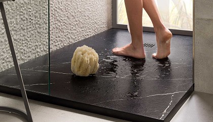 Curve de Nuovvo Platos de ducha Strato TitanLight de Torvisco Group Plato de ducha Wave, de McBath Atrium, el nuevo plato de Krion Shell Platos de ducha a medida de Xtone