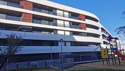 Alcobendas - 10/02/2021: Las lamas Dufix 60T han sido colocadas en un conjunto de viviendas residenciales Lamas de protección solar Durmi en un edificio de Alcobendas En Industrias Durmi son expertos
