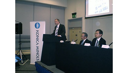 atril, junto a Akio Kitani y Junichi Arai, sentados. El propio Kitani añadió sobre la nueva marca Bizhub Press que “proporciona un nuevo reto en la industria de la impresión