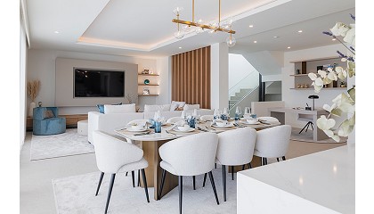 bioetanol integrada en ella. Un papel neutro, pero con textura, aporta calidez a este espacio para hacerlo más acogedor. El sofá se ha hecho a medida para el espacio, así como