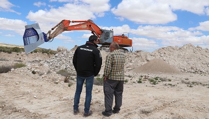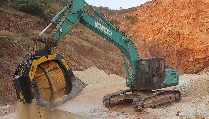 cribadora MB-S18 en la excavadora Kobelco SK220SD en una cantera de arenisca. El resultado fue inmediato: el material extraíido se cribó hasta obtener la granulometría deseada y luego se vendió