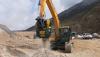 cribadora MB-S14 para cribar roca y tierra a fin de tener el material listo para usar en la nueva construcción. Pinza MB-G1200 montada en excavadora John Deere 180G
