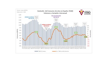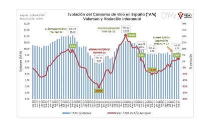 Ene 2024), tanto en (1) Alimentación como en (2) Hostelería. En volumen, las ventas totales de vino realizadas en Alimentación y Hostelería suavizan su caída al -0,9% en el TAM Dic-Ene