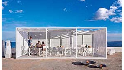 Gandiablasco reinterpreta los tradicionales porches y pérgolas de madera, con materiales contemporáneos y un sistema de estructuras modular para disfrutar del exterior resguardado de la incidencia directa del sol. Con opción